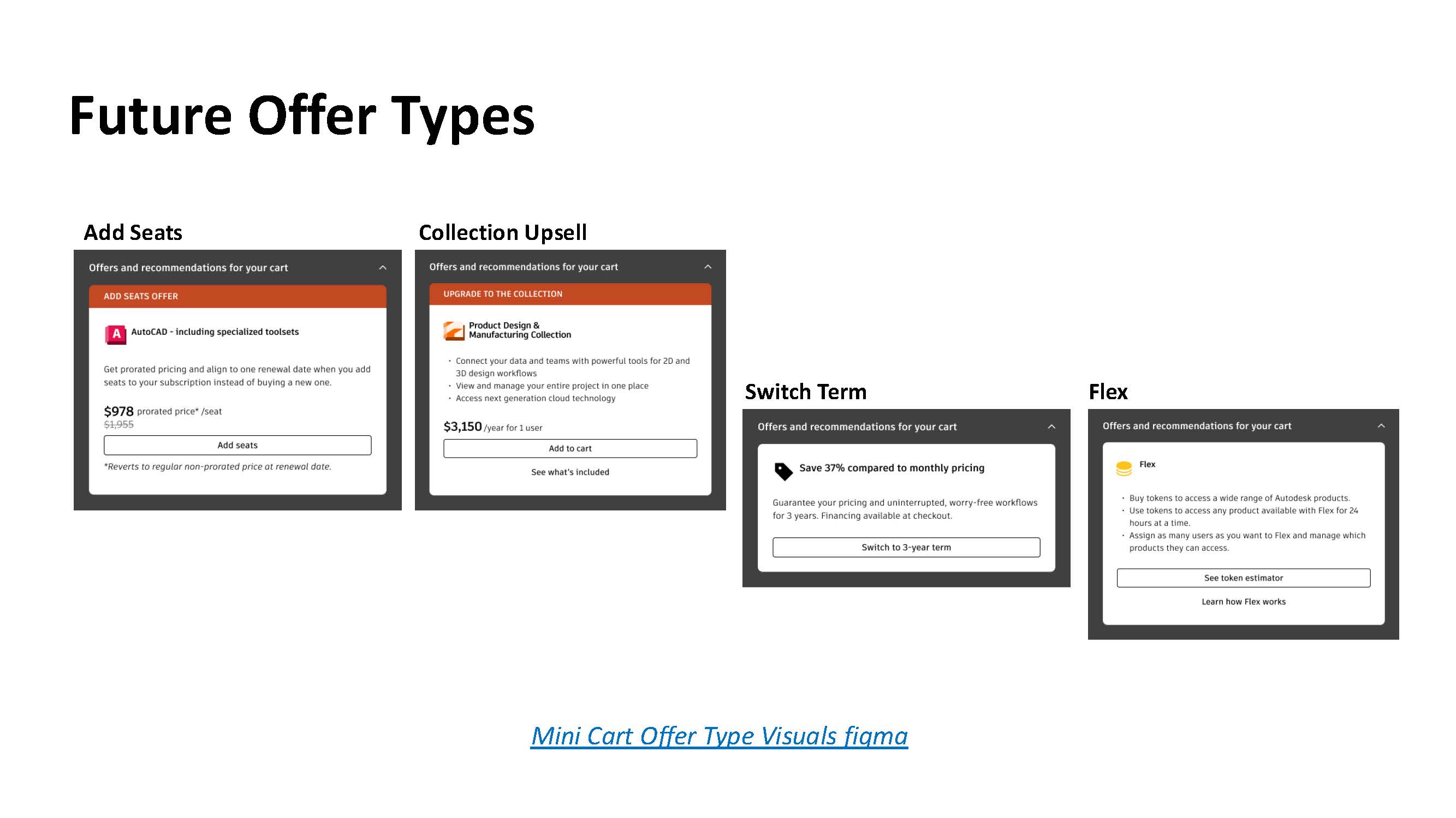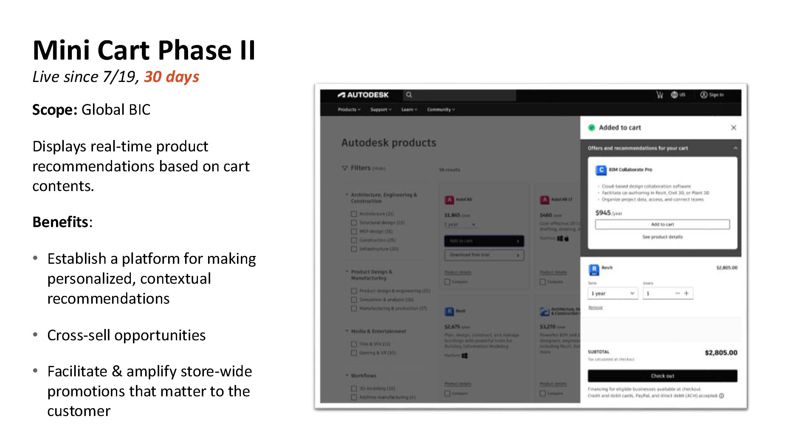 As the lead product manager for the Mini Cart feature, I identified a fundamental gap in Autodesk's e-commerce experience. Believe it or not, we didn't have a modern shopping cart experience—customers couldn't configure products, adjust terms, add multiple items, or even access their cart from the universal header. The name "Mini Cart" came from our vision to bring key checkout capabilities into a smaller flyout panel, creating the modern shopping experience our customers expected.